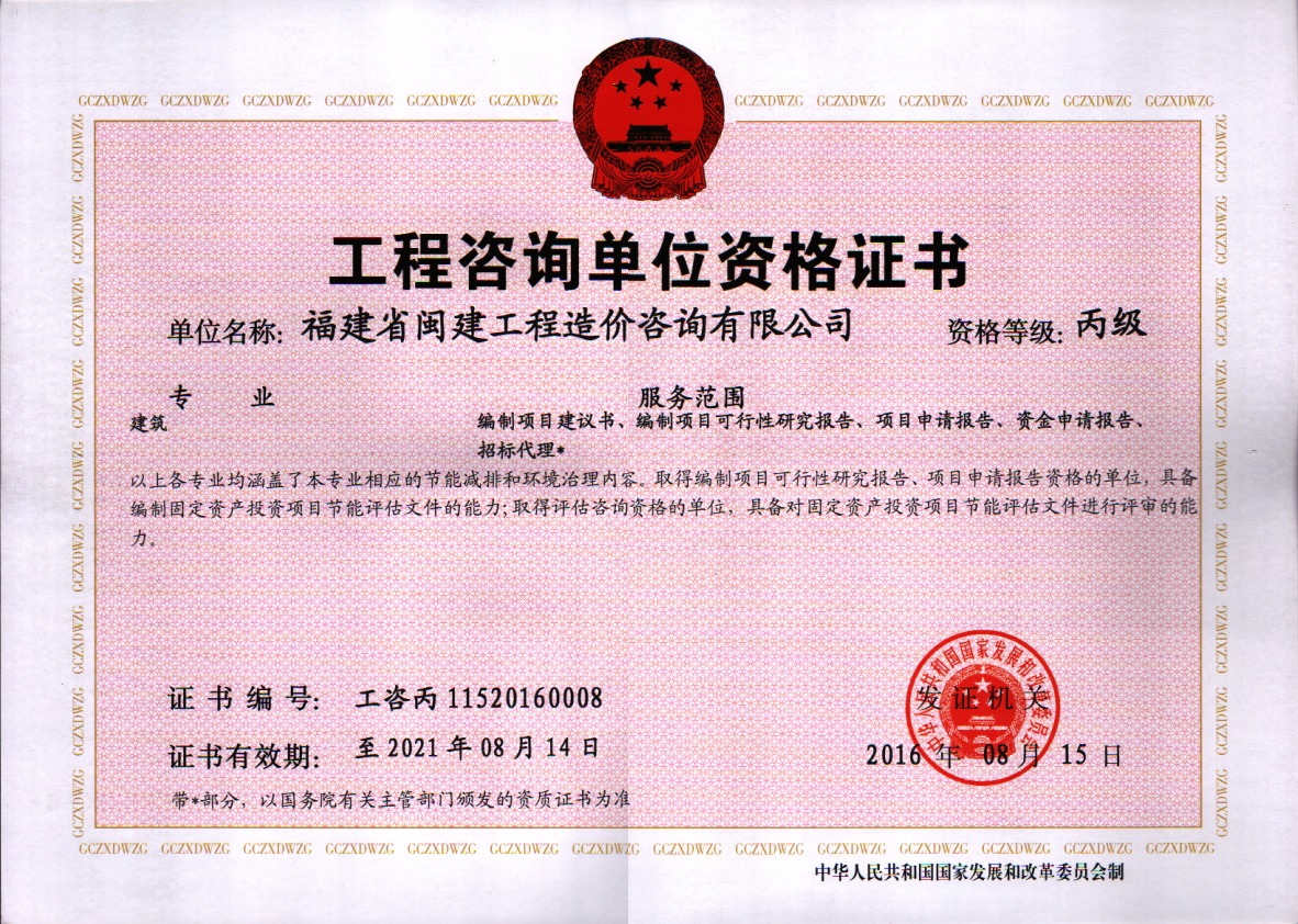 福建省閩建工程造價(jià)咨詢有限公司成立于1993年,原隸屬福建省建設(shè)委員會(huì),2001年脫鉤改制為有限責(zé)任公司,公司注冊資本1200萬元,是一家具有甲級工程招標(biāo)代理資質(zhì)(證書編號:F135000429)、甲級工程造價(jià)咨詢資質(zhì)(證書編號:甲150135000084)、政府采購代理資質(zhì)、預(yù)備級中央投資項(xiàng)目招標(biāo)代理機(jī)構(gòu)資質(zhì)(證書編號:ZYTZ-C2013239)、丙級工程資質(zhì)(證書編號:工咨丙11520160008)的綜合性工程咨詢服務(wù)單位。能承擔(dān)各類建設(shè)項(xiàng)目的工程招標(biāo)代理、工程造價(jià)咨詢...